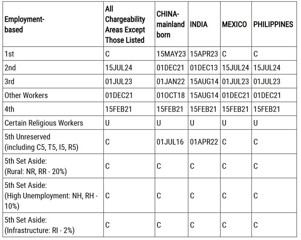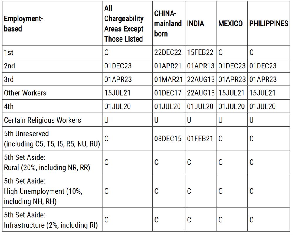 B表:Dates For Filing Of Employment-Based Visa Applications