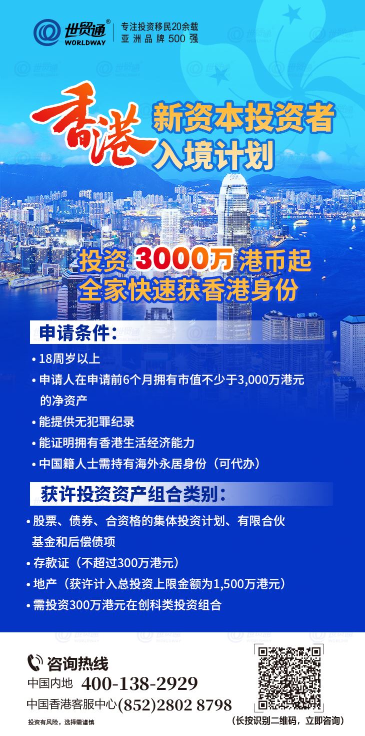 香港「新资本投资者入境计划」,是香港政府为资本投资者专门设立的移民通道,目的是让那些把资金带来香港投资但不会在港参与经营业务的人士来港居留,投资者只需要在不同的许可资产类别中选择自己的投资项目进行投资,即可获得香港身份。该计划于2003年10月1日起实施,自2015年1月15日起暂停,2023年10月25日香港「新资本投资者入境计划」重启,2024年3月1日起正式接受申请。