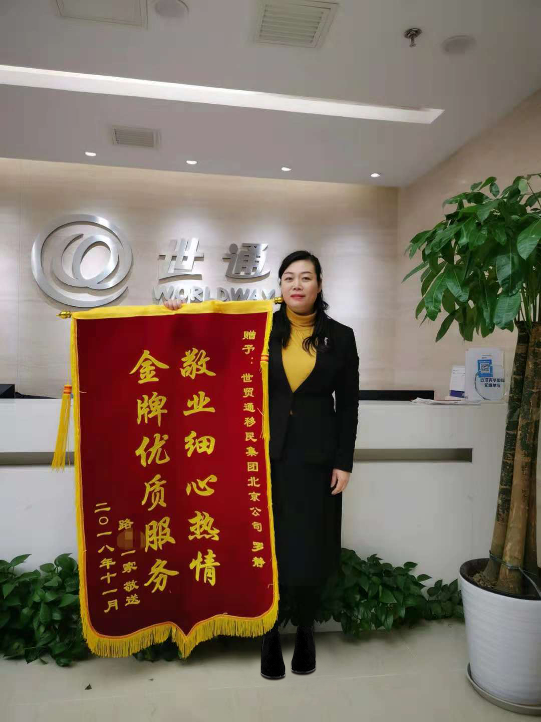 近日,世贸通集团喜讯不断,在喜迎多批客户获批的同时,世贸通的优质专业服务也得到众多客户的高度赞扬,世贸通北京公司业务总监罗静女士更是收到客户送来的锦旗,上书“敬业细心热情,金牌优质服务”,以表达对世贸通团队的感谢。一面锦旗,承载的是客户的赞扬与肯定,更彰显了世贸通集团的专业和优质服务。客户的满意度和认可度节节提升,正是对世贸通集团最大的肯定。世贸通集团愿与每一位投资者一路同行,全力以赴,为移民梦想而努力。