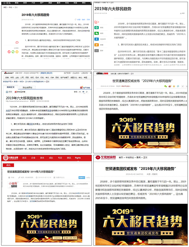 2018年,全球移民形势跌宕起伏,多个国家移民政策及条件变幻莫测,那么,2019年的移民市场又将朝着什么趋势发展?近日,世贸通集团发布了“2019年六大移民趋势”,引起行业及国内众多媒体的广泛聚焦,新浪网、网易、搜狐网、财经网等主流媒体纷纷进行转载报道,这也是世贸通集团连续四年预告移民趋势,每次都成为业内外人士共同关注的焦点。