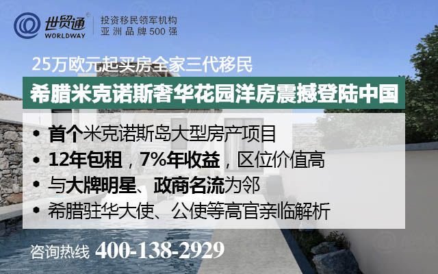 6月14-16日,世贸通米克诺斯奢华花园洋房震撼登陆中国,首个米克诺斯岛大型房产项目,12年包租,7%年收益,区位价值高,与大牌明星、政商名流为邻,希腊驻华使馆高官亲临解析。咨询热线:400-138-2929。