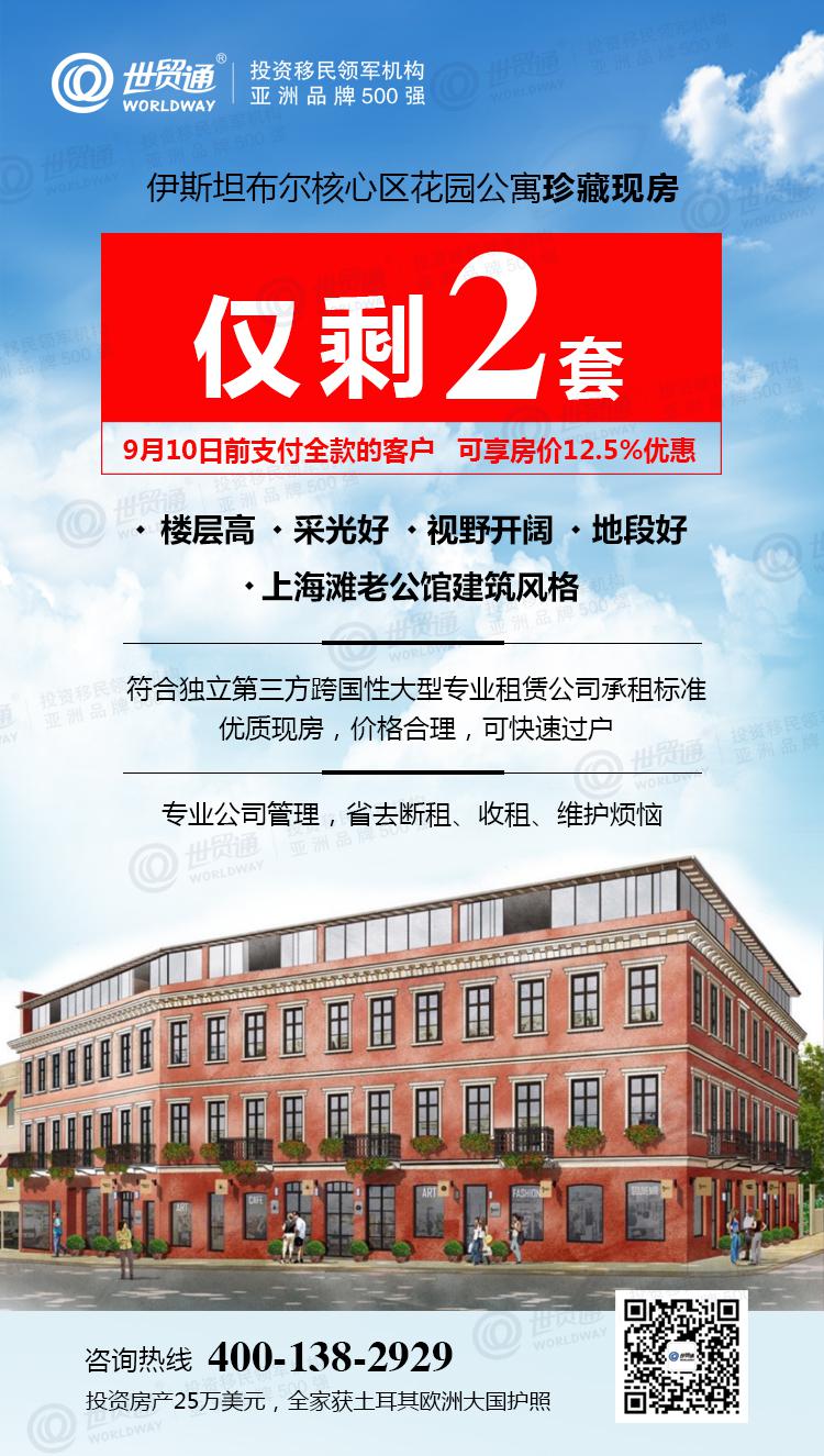 目前,伊斯坦布尔核心区花园公寓珍藏现房,仅剩2套,正在火热销售中,9月10日前支付全款的客户,可享房价12.5%优惠。优质现房,价格合理,可快速过户,专业公司管理,省去断租、收租、维护烦恼。房源有限,先到先得。