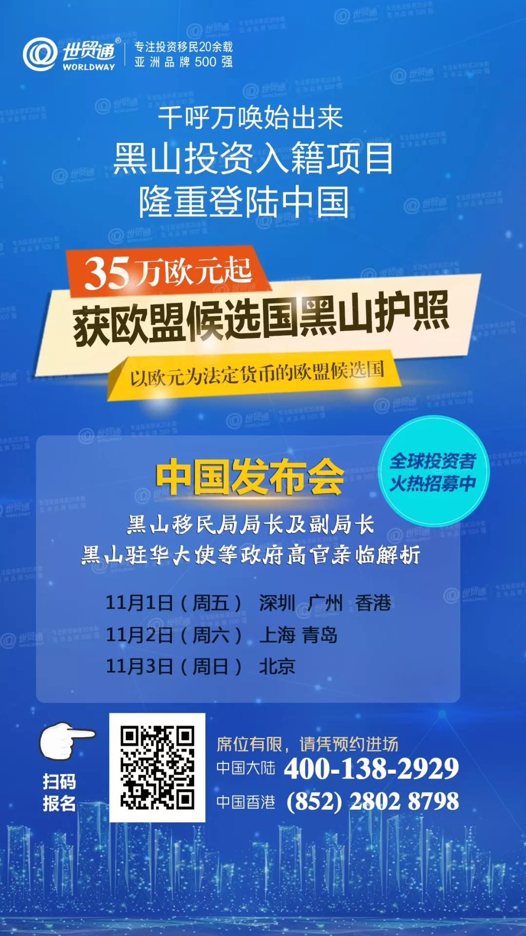 世贸通集团携手黑山政府,将于11月1日-3日在中国深圳、广州、香港、上海、青岛、北京,举办黑山投资入籍项目登陆中国发布会!届时,黑山移民局局长及副局长、黑山驻华大使等政府高官将亲临现场,为您多方面介绍黑山及黑山投资入籍政策,机会难得!