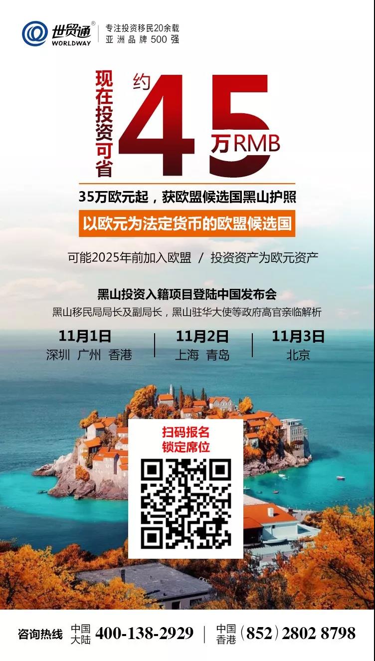 目前,黑山已列入欧盟东扩计划,顺利进入到欧盟候选国第一顺位,并可能在2025年之前加入欧盟!对于投资者而言,黑山投资入籍项目的正式推出,开启了投资者在未来获得欧盟公民身份的蹊径!同时,投资35万欧元起,不仅获欧盟候选国黑山护照,还能配置欧元资产,黑山将欧元作为法定货币,投资资产为欧元资产,是一个双赢的选择。更重要的是,目前选择投资移民黑山,可省约45万元人民币。名额有限,请抓紧时间预约!咨询热线:400-138-2929或点击阅读原文咨询