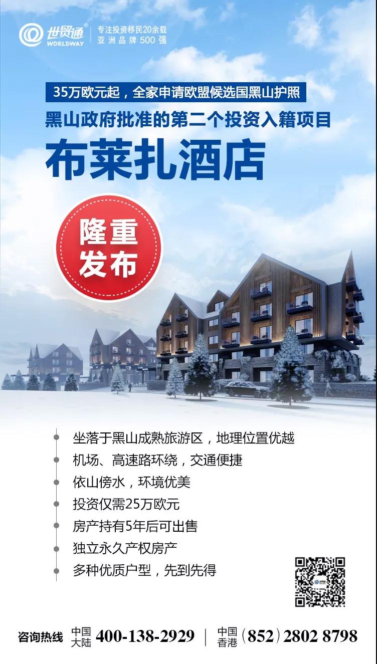 此外,近日隆重发布的黑山政府批准的第二个投资入籍项目——布莱扎酒店项目,亦是较佳选择!该项目为独立永久产权房产,有多种户型可自由选择,项目位于黑山北部旅游中心,地理位置优,机场、高速环绕,交通便捷,且由知名国际酒店品牌运营管理,规划打造为五星级酒店。好项目不等人,有意者先到先得!