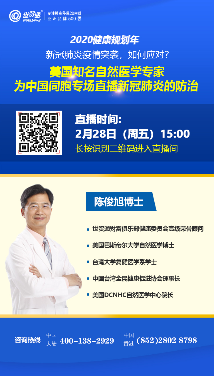 目前,正处疫情特殊时期,对自然医学领域感兴趣,倡导不打针、不吃药等健康养生方式的世贸通新老客户,一定不要错过2月28日陈俊旭博士首场面向中国同胞的第一期线上直播讲座!锁定世贸通线上直播课,宅家聆听知名自然医学专家关于疫情防治秘诀,内容精彩纷呈,请抓住机会!