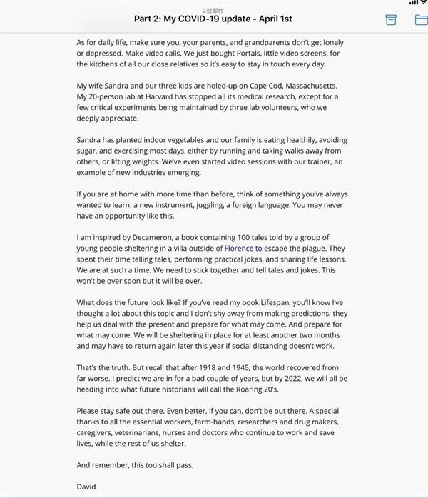 对于日常生活,请确保你,你的父母和祖父母们不是孤独沮丧的,与他们进行视频通话。我们近期为平时常联络的亲戚们都购买了Portal,一个很小的视频屏幕装在厨房,以便每天轻松保持联系。 我的妻子Sandra和我们的三个孩子如今都住在马萨诸塞州的科德角(Cape Cod)。我在哈佛的20人实验室除了3名实验室志愿者在进行一些关键实验以外,已经停止了所有医学研究,我们对他们深表感谢。 Sandra种植了各种室内蔬菜,我们家人通过跑步和散步或举重来保持健康,饮食上避免吃糖。我们甚至已经与健身教练开始了视频课程,这是新兴产业中的一个例子。 如果你比以前有更多的时间在家,请想一想你一直想学习的东西:新乐器,杂耍或外语。您可能永远不会再有这样的机会了。 我受到Decameron的启发,Decameron是一本书,其中载有100个故事,说到一群年轻人为了躲避瘟疫而躲藏在佛罗伦萨郊外的一座别墅中,他们花时间讲各种故事,讲实用的笑话和分享生活经验。我们正处于这样的时刻。我们需要团结一致,讲故事和玩笑。目前这一切不会很快结束,但终将结束。 未来会是什么样的?如果你读过《生命周期》一书,就会知道我对这个话题已经做了很多思考,并且我会不回避的做出预测。这些预测可以帮助我们应对当下并为将来的事情做准备。我们将至少再居家隔离两个月,如果社交距离不起作用,我们可能必须在今年下半年的时候再次实施居家令。 这是事实,但是也请记得,在1918年和1945年之后,世界曾从更加糟糕的情况中恢复过。我预计我们会经历几年糟糕的情况,但是到了2022年,我们所有人都将进入未来的历史学家称之为“咆哮的2000年代”的一个新时代。 在这段期间,如果需要外出,请注意安全。如果可以的话,最好不要外出。特别感谢所有坚持岗位的工作人员,农场工人,研究人员和药物生产商,护理人员,兽医,护士和医生,他们夜以继日的工作,挽救生命。我们和大部分人在此时却可以安全的待在家中。 请不要忘记,这一切,终将过去。