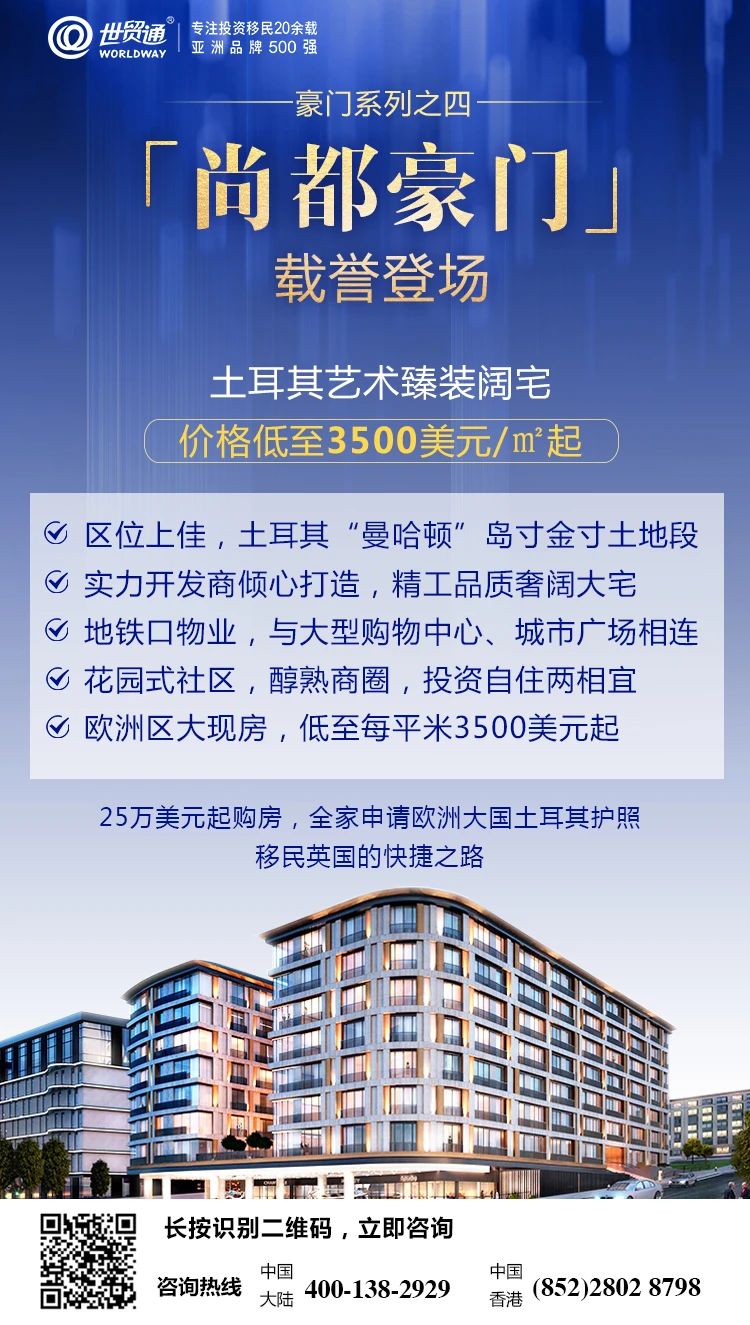 亚洲品牌500强的世贸通集团,作为较早推广欧洲买房移民项目的移民机构,近日携手土耳其实力开发商,向广大投资者介绍又一重磅项目——位置上佳的土耳其“曼哈顿”岛寸金寸土地段,实力开发商倾心打造,欧洲区精工品质奢阔大宅,较具颠覆性的性价比 ,价格低至每平米3500美元起,土耳其艺术臻装阔宅「尚都豪门」载誉登场!