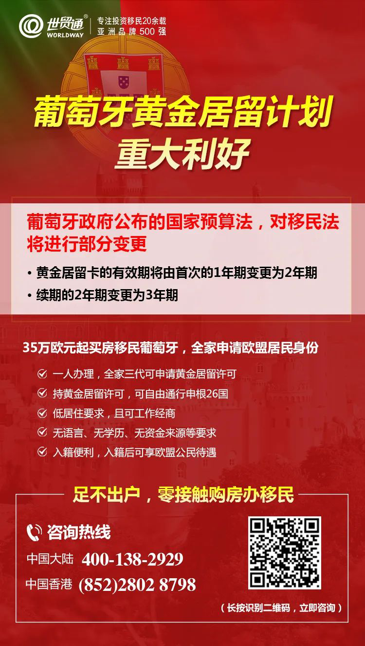 目前,通过葡萄牙黄金居留计划,投资者购买35万欧元起的房产,可全家三代申请葡萄牙黄金居留身份,享受葡萄牙优厚社会福利和优质教育资源,畅游26个申根国,同时还能收获永久产权的房产,可谓一举多得!