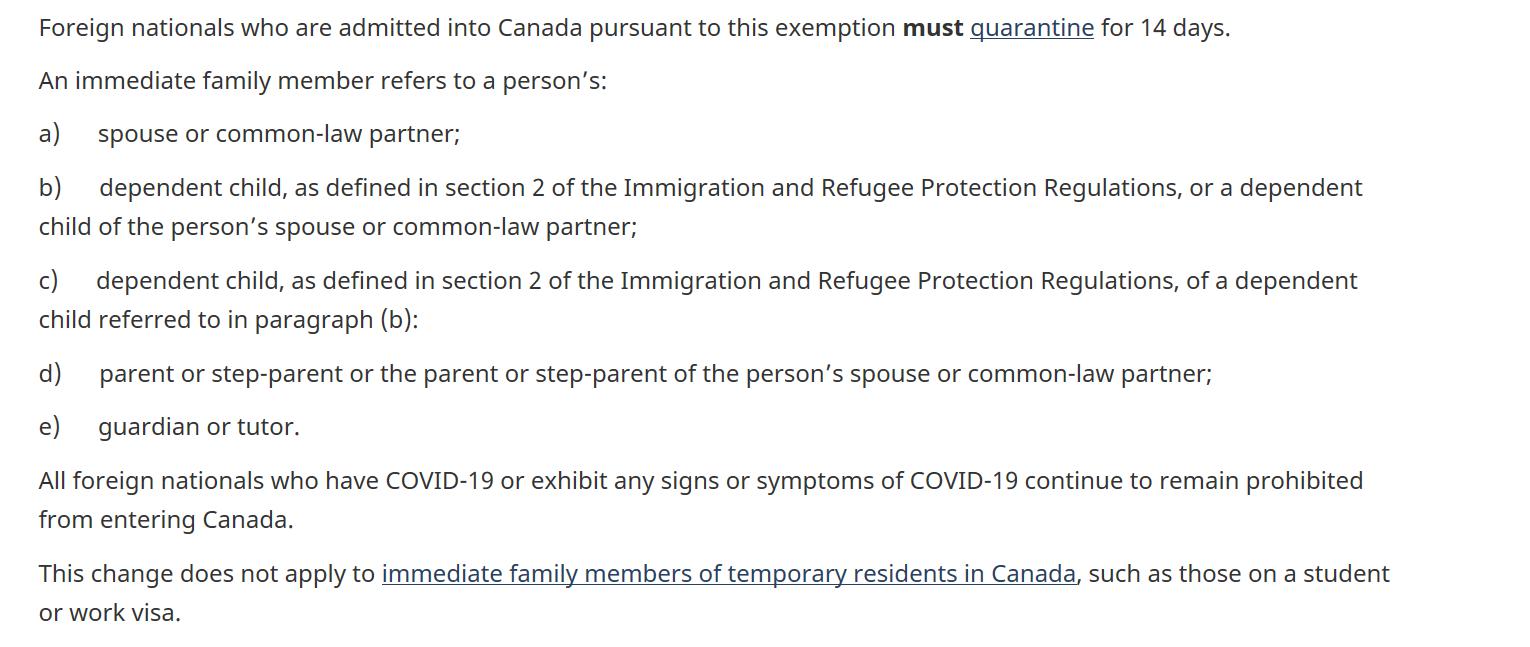 加拿大边境服务局表示,此项豁免政策将于东部时间6月8日晚23:59分起施行,且该政策的适用对象包括外国公民。只要能证明自己是加拿大公民或永久居民的直系亲属,且自己没有任何新冠症状或“没有理由相信已感染新冠病毒”,并与直系亲属一起居住至少15天,则可以进入加拿大境内。