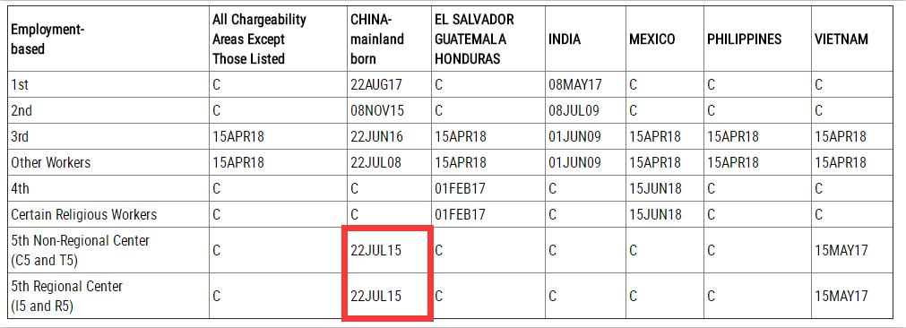 中国大陆投资人EB-5签证排期在3月份和5月经历了2次大幅跃进,3月份EB-5签证A表前进5.5个月,B表前进7个月;5月份,EB-5签证排期A表前进47天。6月份与7月份中国大陆投资人EB-5签证排期继续保持稳步推进,6月份EB-5签证排期A表前进14天;7月份EB-5签证排期A表前进7天。3月份A/B表大幅推进使得大量投资者可以较此前预测早约2年的时间提前登陆美国或者在美国转换身份;而不少原本面临子女超龄风险的投资人因此赢得重大转机。
