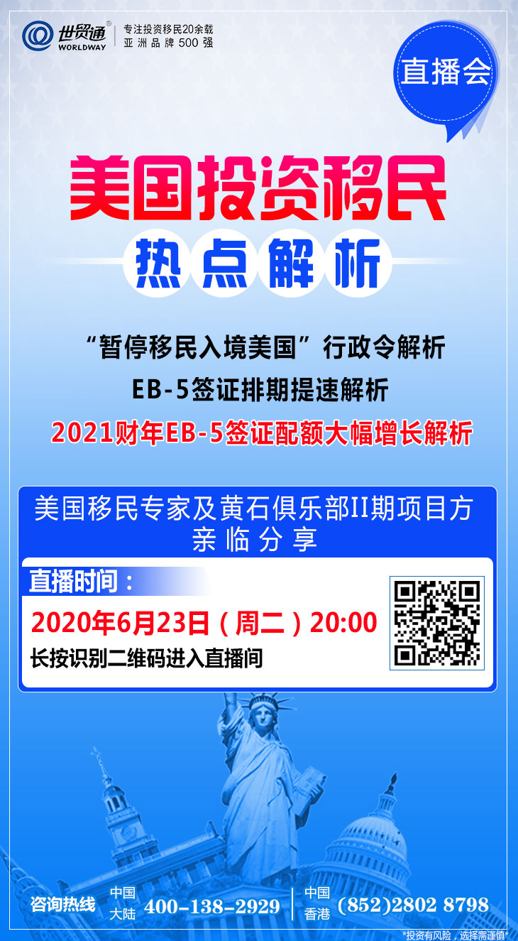2020健康规划年,健康规划,身份先行。好项目不等人,遗憾错过50万美元投资移民美国机会,切不可再错过90万美元投资移民美国机会,优质项目可遇不可求,预订从速。项目详情咨询:中国大陆:400-138-2929;中国香港:(852)2802 8798。