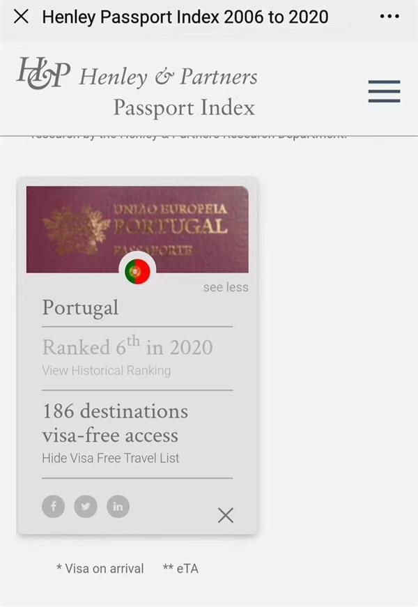 近日,2020年第二季度恒理护照指数(Henley Passport Index)公布。其中,葡萄牙护照凭借186个免签证或落地签证国家和地区,排名第6位。