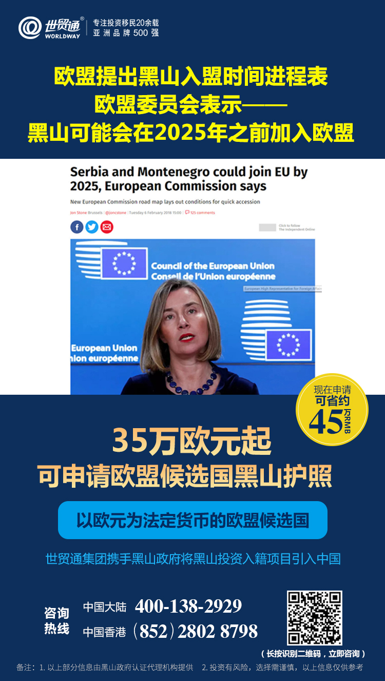 在开放投资入籍项目的国家中,黑山是明确加入欧盟时间进程的国家!欧盟委员会公开表示黑山“可能会在2025年之前加入欧盟”,欧洲议会官网发布的一份报告称,黑山是加入欧盟排名靠前的候选国!作为拟加入欧盟的国家,黑山加入欧盟已得到欧盟及欧盟成员国众官员的广泛支持。自欧盟开启与黑山的入盟谈判以来,目前谈判非常顺利,已进入到了最后的谈判章程!黑山投资入籍项目的推出,为投资者开辟了在未来获得欧盟公民身份的便捷途径,到时拥有的黑山护照或将升级为欧盟护照!