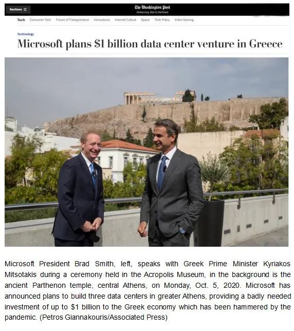 报道称,微软目前在26个国家设有数据中心,其中7个设立于欧盟。此次合作并非微软第一次投资希腊。此前,微软就与希腊政府合作,开展了关于奥运会的发源地古奥林匹亚的增强现实项目。
