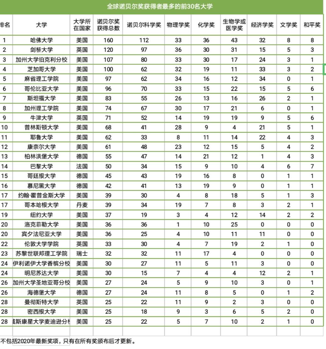 全球高校荣获诺贝尔奖的数量,从一定层面上体现出该校的学术实力和在世界学术界的地位。从上表中可看出,1901年至2019年世界各高校诺贝尔奖人数分布(只展示前30名),美国的实力强悍,19所大学上榜。