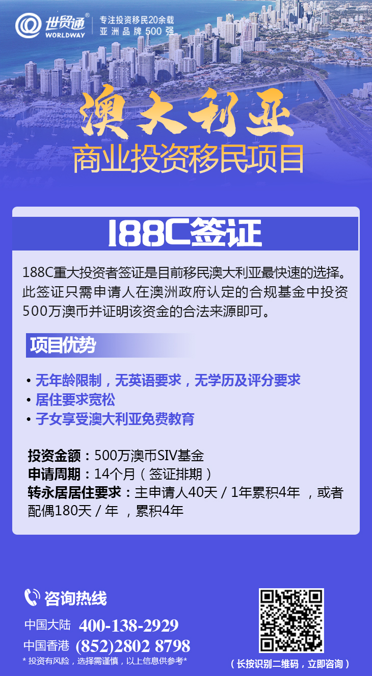 大家知道,一直以来,澳洲都是个传统的移民国家,从澳大利亚移民政策30多年的演变历程来看,门槛不断提高,澳洲移民政策持续收紧。对于有意向移民澳洲的人士而言,可根据自身情况选择适合自己的方式,如188A签证、188B签证、188C签证、132A签证等,均是受中国高净值人士青睐的澳洲移民项目。申请者满足相关条件后,可申请全家移民澳大利亚,享受澳洲众多福利。获得澳大利亚身份后,子女即可享受高素质教育,获得更为广阔的海外发展范围和机会。