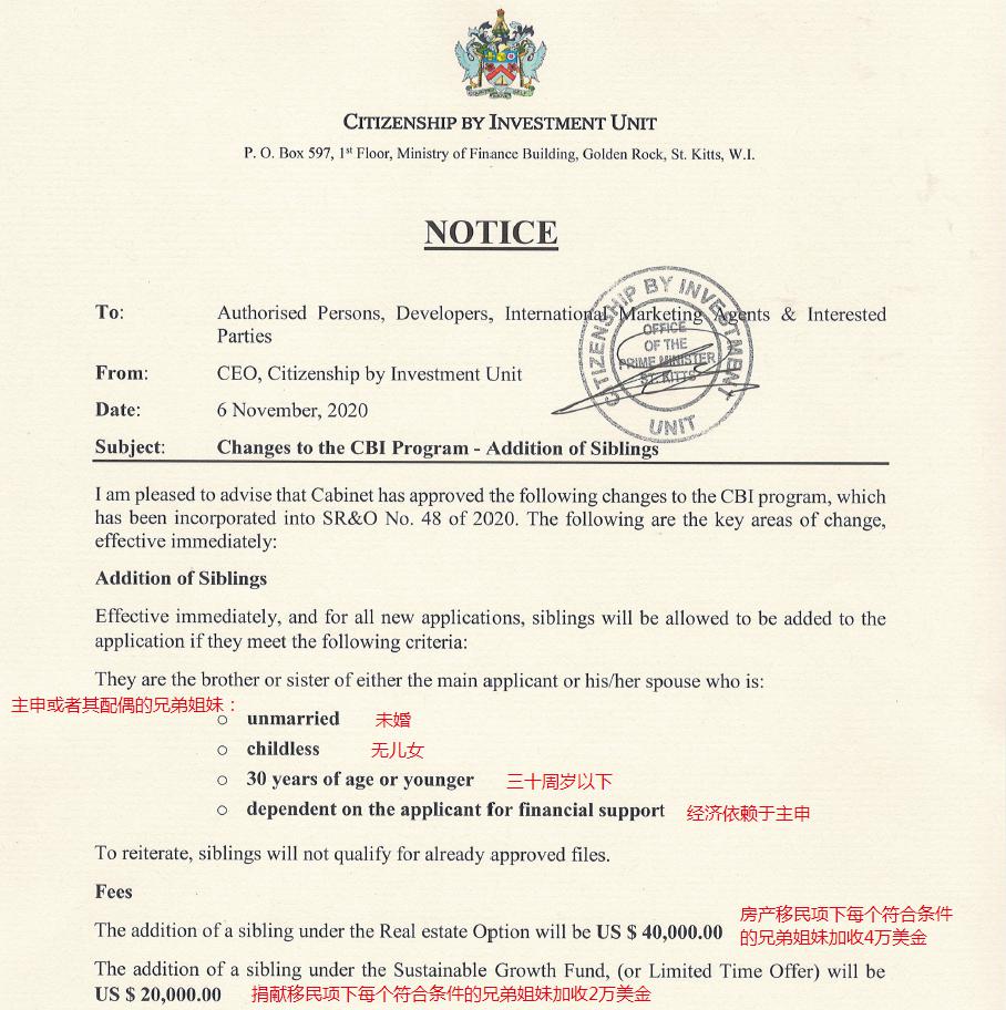近日,圣基茨和尼维斯移民局发布通知:11月6日起,主申请人或者配偶的兄弟姐妹可随同主申请人一同移民。