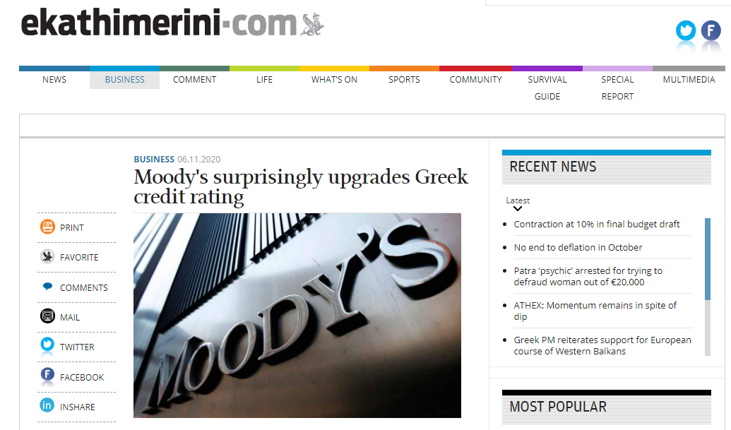 据希腊媒体报道,近日,国际知名评级机构穆迪(Moody’s)提高了希腊的信用评级。穆迪这一举措,为国际市场对希腊经济复苏前景投下了信心票!
