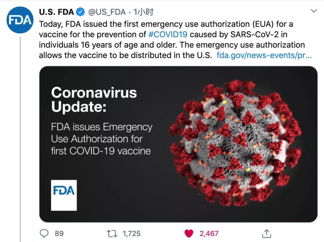 全球疫苗再次传来重大消息!美国当地时间12月11日,美国食品药品监督管理局(FDA)批准辉瑞和BioNTech合作研发的新冠疫苗紧急使用授权。这意味着美国第一支新冠疫苗正式获批,美国由此成为了继英国、加拿大等国之后正式投入新冠疫苗使用的国家。