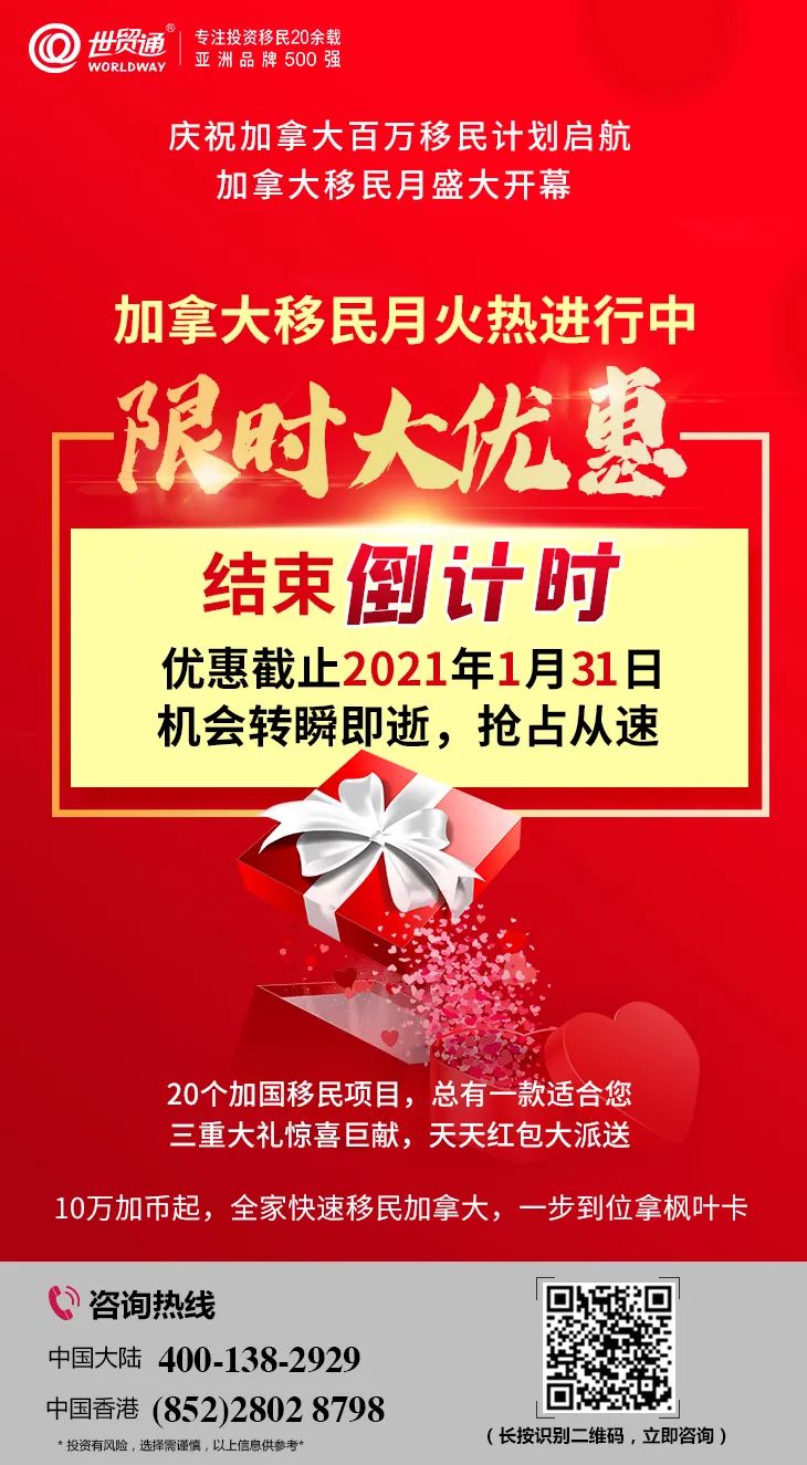 2021年,是加拿大百年不遇的移民黄金年,亦是加拿大实施百万移民计划的第一年。1月,加拿大百万移民计划正式启航,加拿大移民月盛大开幕!为感谢新老客户一直以来对世贸通的支持与信赖,2021年1月,世贸通特推出加拿大移民月限时大优惠,受到众多移民投资者的高度关注和积极参与!