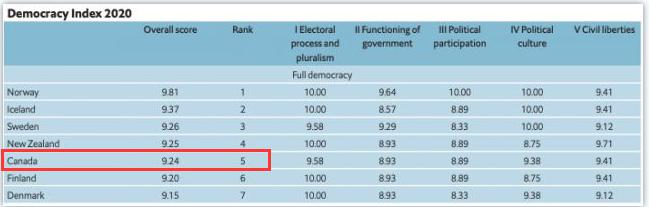 近日,英国《经济学人》集团旗下智库(EIU)发布了2020年全球民主指数排名。其中,加拿大在全球国家民主程度排名中位列第5位,属于“完全民主”的国家。