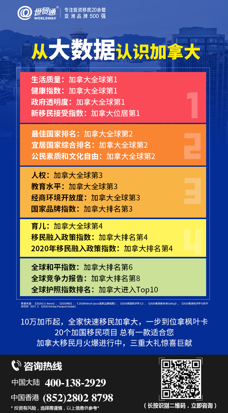 众所周知,在过去的一年中,加拿大在各类世界排名中都表现优秀。无论在“民主指数”、“教育质量”、“安全指数”还是“护照通行度”等等,加拿大均名列前茅!与此同时,加拿大在收新移民方面更是持敞开怀抱的态度。加拿大移民部长门迪奇诺曾在新闻发布会上表示:移民在加拿大人口增长与经济增长中都扮演着至关重要的角色,我们坚信移民是帮助加拿大短期经济复苏和长期经济繁荣的关键!