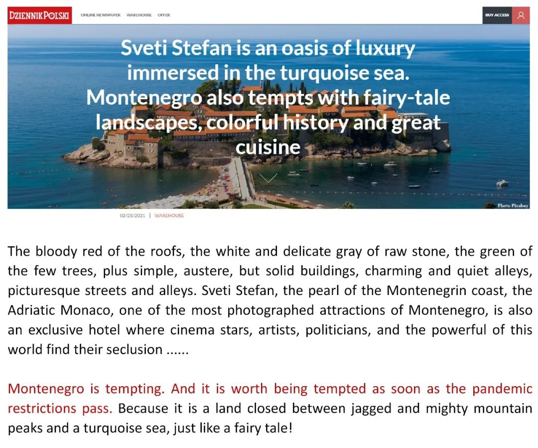 近日,波兰知名媒体Dziennik Polski报道称:在疫情大流行之后,黑山是一个非常值得前往游览的理想目的地。其理由是:黑山很诱人,它是一个山峰苍翠,碧绿如海的国家,就像童话故事一样。黑山有着吸引人的童话般风景、丰富多彩的历史和美味佳肴。