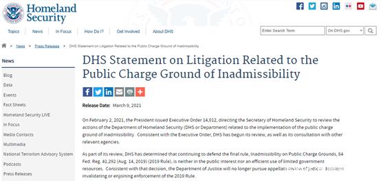 目前,国土安全部正式删除了已失效的2019年版“公共负担”新规。同时,美国移民局也发布声明,不再使用2019年的公共负担规则,重新启用1999年版的《公共负担不予受理》的临时现场指导意见。此后,美国移民局不会再将申请人的医疗补助、公共住房、补充营养援助计划等福利视为公共负担的一部分。
