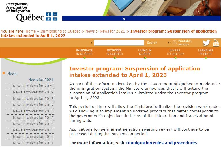 近日,加拿大魁北克省移民部部长公布了一项有关继续暂停“魁省投资移民项目(QIIP)”的部长令。加拿大魁北克移民部网站已于当地时间2021年3月31日就相关项目暂停发布正式通知。