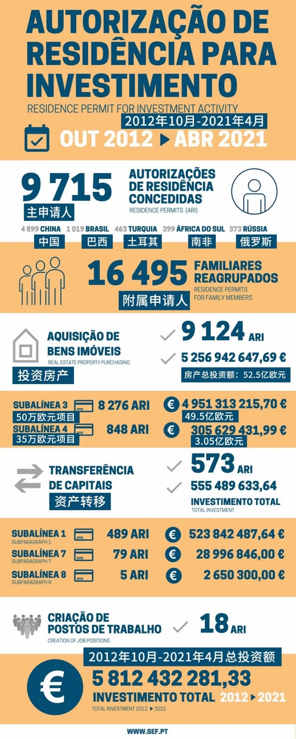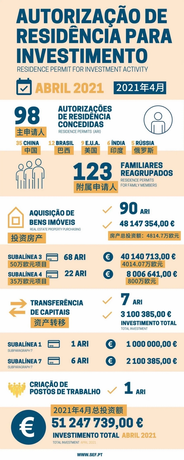 近日,葡萄牙移民局(SEF)公布了2021年4月份的黄金签证数据。该数据显示出葡萄牙黄金签证项目继续回暖,2021年4月份,共计有98位主申请人和123位附属申请获批葡萄牙黄金签证,投资额达5124.77万欧元,比上月增长了1448.94万欧元,增幅高达39.4%。