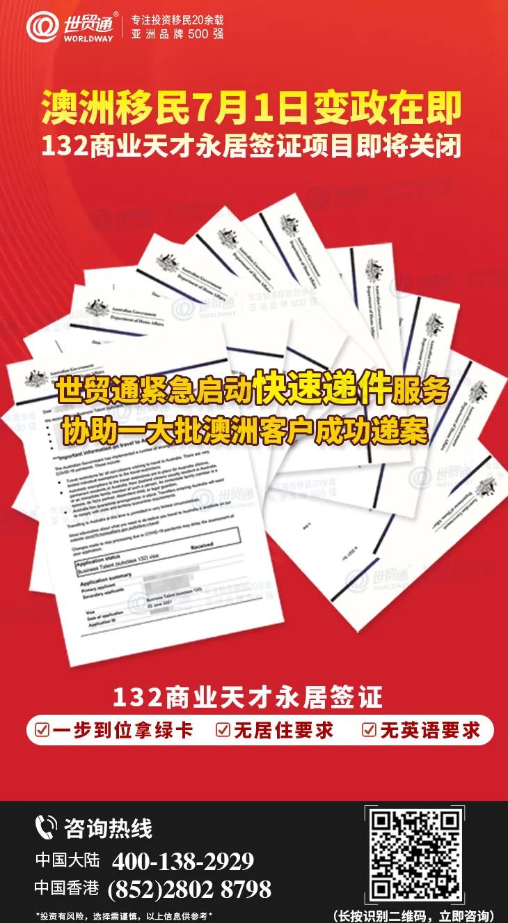 亚洲品牌500强,专注投资移民20余载的世贸通集团,一直用实际行动践行着“客户为尊”的服务宗旨和理念。此次大批澳洲移民客户的成功递案,再次体现了世贸通集团始终用专业、高素质、快捷的服务,助力每一位投资者顺利实现移民梦。2021年7月1日起澳洲投资移民将全面启动新规,世贸通也会密切关注,及时给大家带来新的政策动向分享。