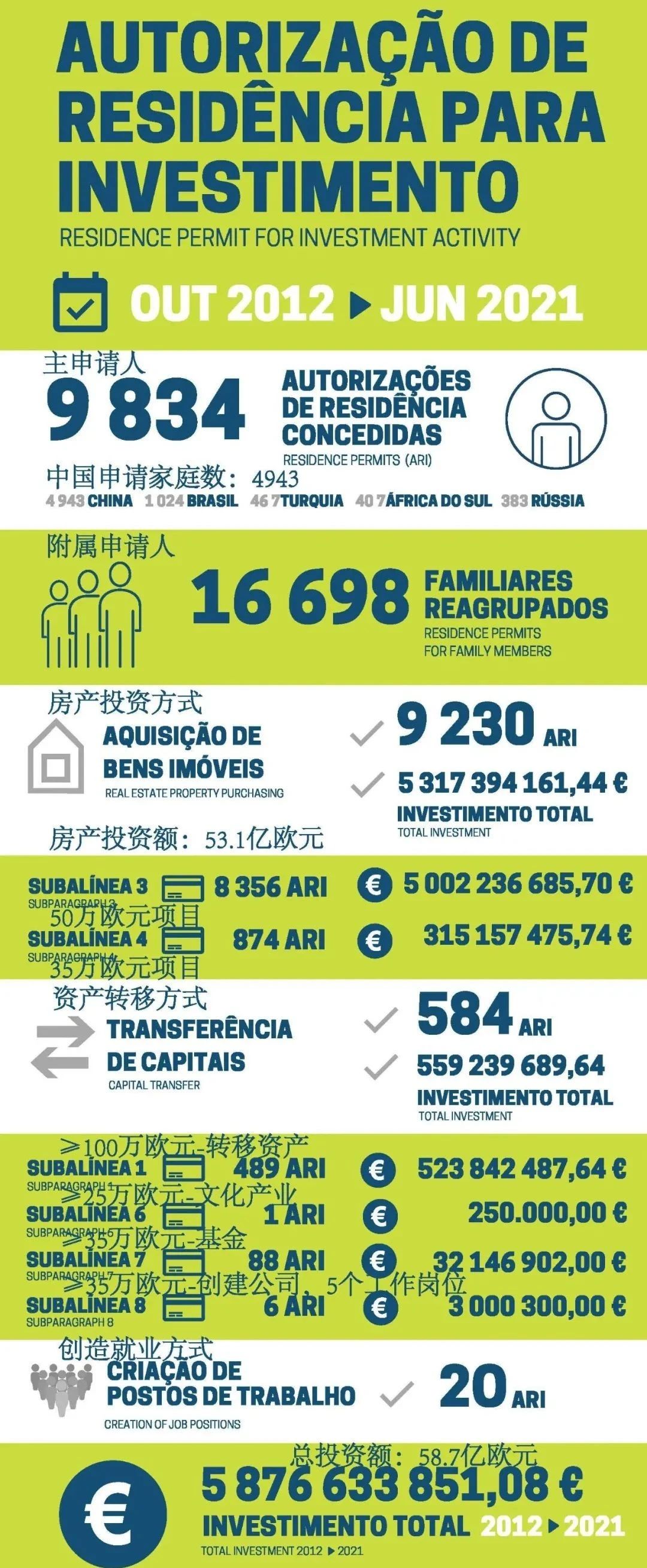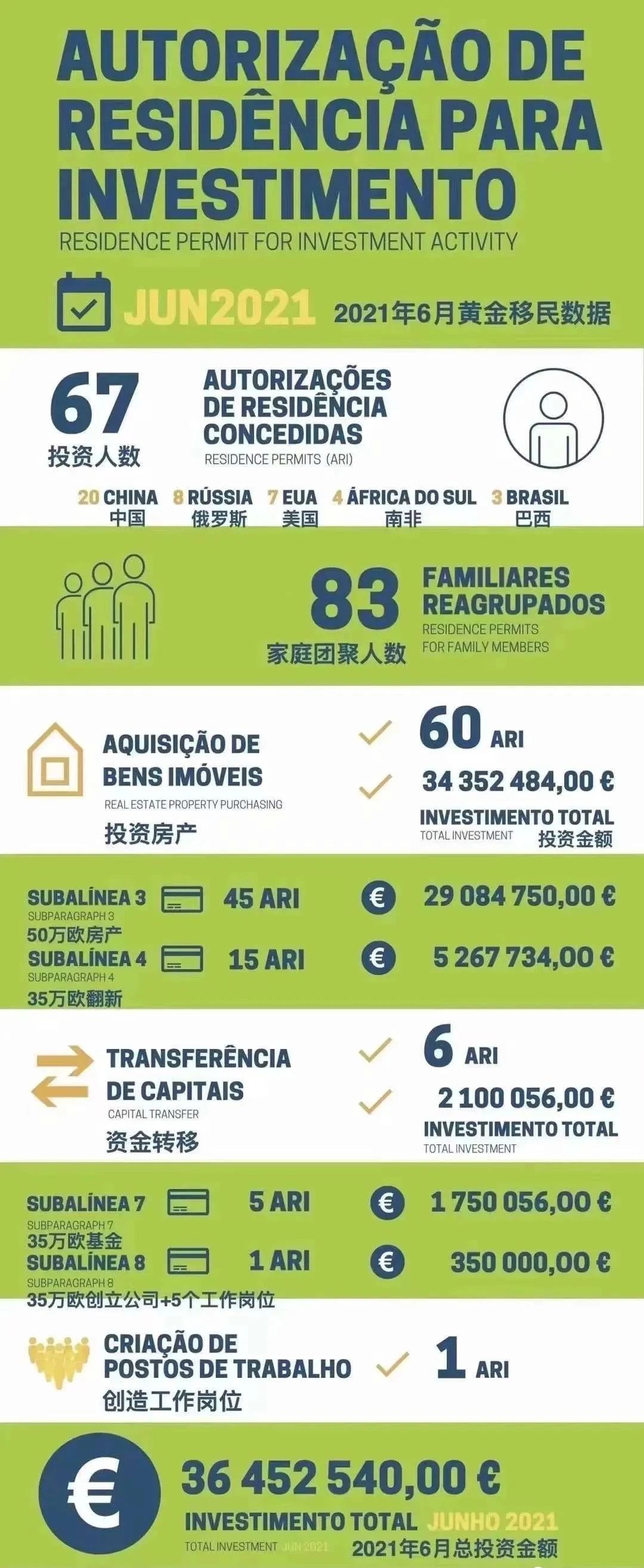 近日,葡萄牙移民局(SEF)公布了2021年6月份的黄金签证数据。2021年6月份,共计有67位主申请人和83位附属申请获批葡萄牙黄金签证,投资额为3645万欧元。其中,来自中国的申请人达到了20位,占总数近三成。