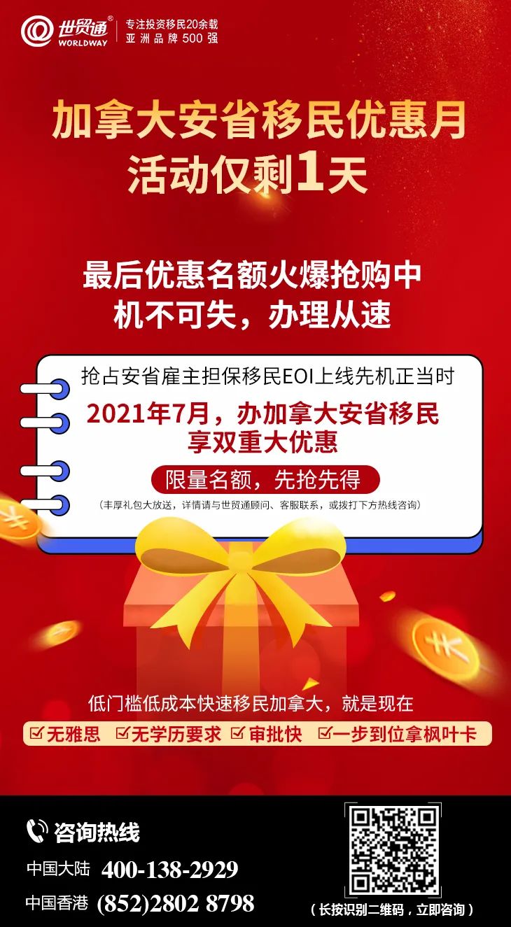 加拿大安省移民优惠月进入最后倒计时,活动仅剩1天,时间紧迫,抢占最后优惠名额分秒必争!更多详情,请拨打世贸通服务热线,中国大陆:400-138-2929 中国香港:(852) 2802 8798