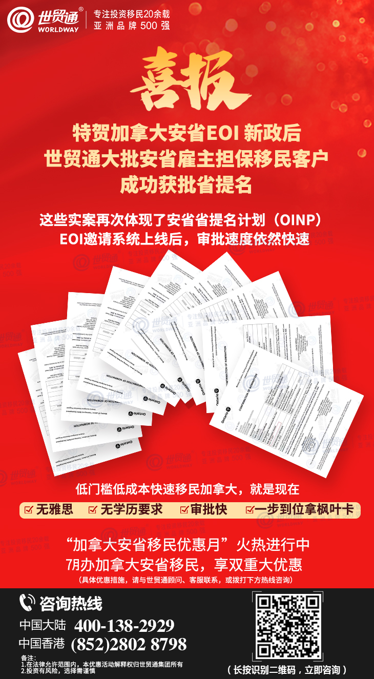 与此同时,在“加拿大安省移民优惠月”活动期间,世贸通推广的安省移民项目同样喜讯不断,世贸通各司文案团队和项目团队密切配合,通力合作,协助大批安省雇主担保客户获邀,并助力一批又一批客户成功完成安省省提名递案,再次体现了世贸通集团的专业实力!我们由衷的恭喜投资人,在别人犹豫时主动出击,成功抓住目前低门槛快速移民加拿大安省的上佳机会!