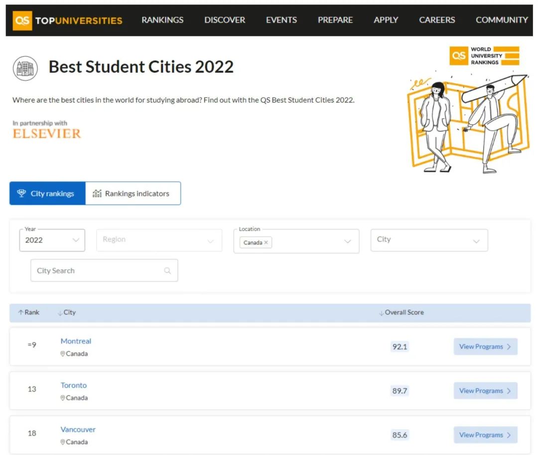 2022最佳留学城市排名:加拿大三城跻身全球前20