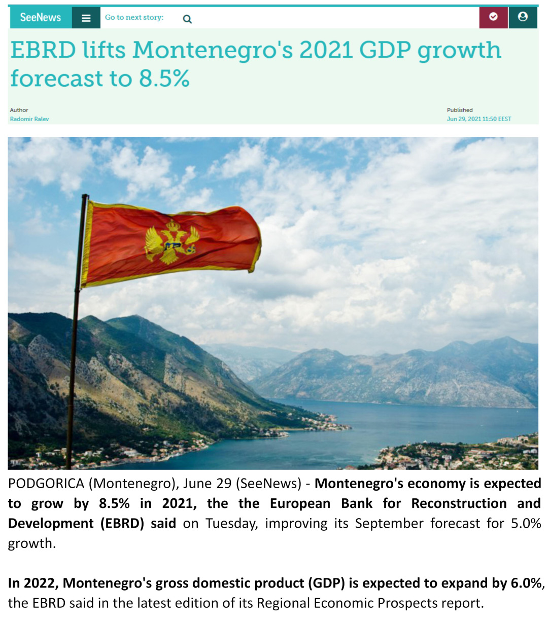 近日,欧洲复兴开发银行(EBRD)在最新的区域经济展望报告中表示,整个西巴尔干地区,预计2021年和2022年经济增长分别为5.1%和3.8%。引人关注的是,EBRD特别指出,2021年黑山经济将增长8.5%,远高于此前 5.0% 的增长预测,并且2022年黑山经济将继续复苏,预计增长6%!
