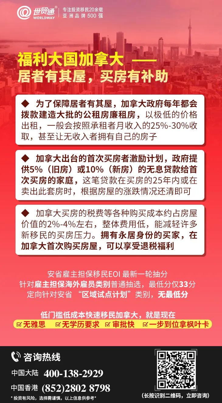 实际上,在住房福利方面,加拿大政府还出台了“首次买房者激励计划”,即政府提供5%(旧房)或10%(新房)的无息贷款给首次买房的家庭;拥有永居身份的买家,在加拿大首次购买房屋,可以享受退税福利;为了保障居者有其屋,政府每年拨款建造大批的公租房廉租房,以极低的价格出租,甚至让无收入者拥有自己的房子。