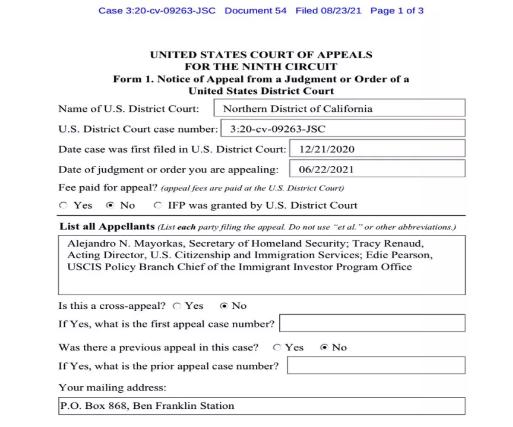 2021年8月23日,美国国土安全部就北加州联邦法院针对贝林区域中心(Behring Regional Center)与美国国土安全部的诉讼裁决向第九巡回上诉法院正式发出上诉通知。此前北加州联邦法院于6月22日就贝林区域中心(Behring Regional Center)与美国国土安全部的诉讼作出裁决,认定移…
