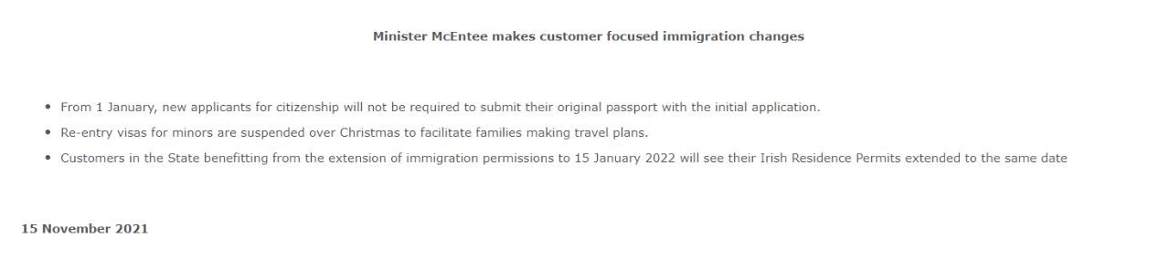 近日,爱尔兰司法部宣布了一系列利好的移民举措。包括:简化入籍申请程序;以及临时放宽持过期但符合延期要求的IRP卡人士的出入境限制,以方便他们能在圣诞假期及2022年1月15日之前往返爱尔兰;同时临时取消了16岁以下儿童需提供再入境签证的要求等。
