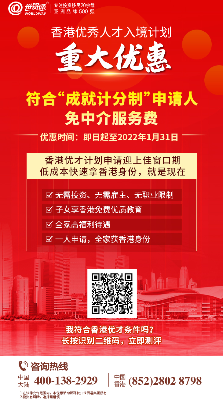 同时,作为目前为数不多的能快速拿香港身份的便捷通道——香港优秀人才入境计划,正备受众多内地投资者热捧!只要申请者符合要求,无须投资金额,无须事先获得本地雇主聘请,到港后可以自由选择工作、定居;一人获批香港身份,全家受益。目前,香港优才计划年度配额创历史新高,有意拿香港身份的投资人宜把握住这一申请良机!