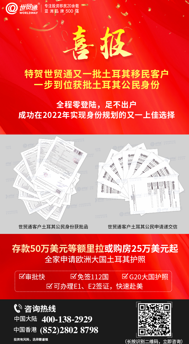 好消息接连不断,世贸通人由衷地激动,这既是2022年带给投资人最好的礼物,也是对世贸通人最好的鼓励与鞭策。作为专注投资移民20余载、亚洲品牌500强的移民机构,世贸通集团助力数万家庭成功移民海外,获批好消息更是频传。此次大批土耳其移民客户成功获批,是继众多加拿大、黑山、希腊、美国、圣卢西亚、瓦努阿图、圣基茨、多米尼克、格林纳达移民客户喜迎获批之后的又一重磅喜讯,再次印证了世贸通的专业实力!