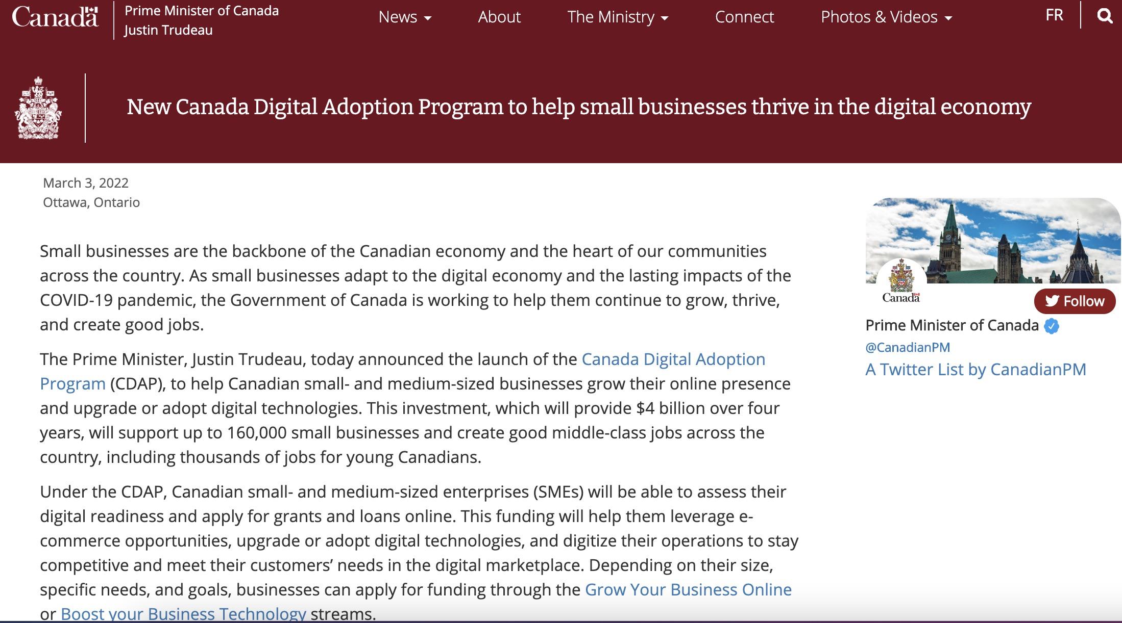 近日,加拿大总理贾斯汀·特鲁多 (Justin Trudeau) 在新闻发布会上宣布:渥太华正在为加速向数字化转型的中小型企业启动一项总值40亿加元的计划,160,000 家中小企业将获益。