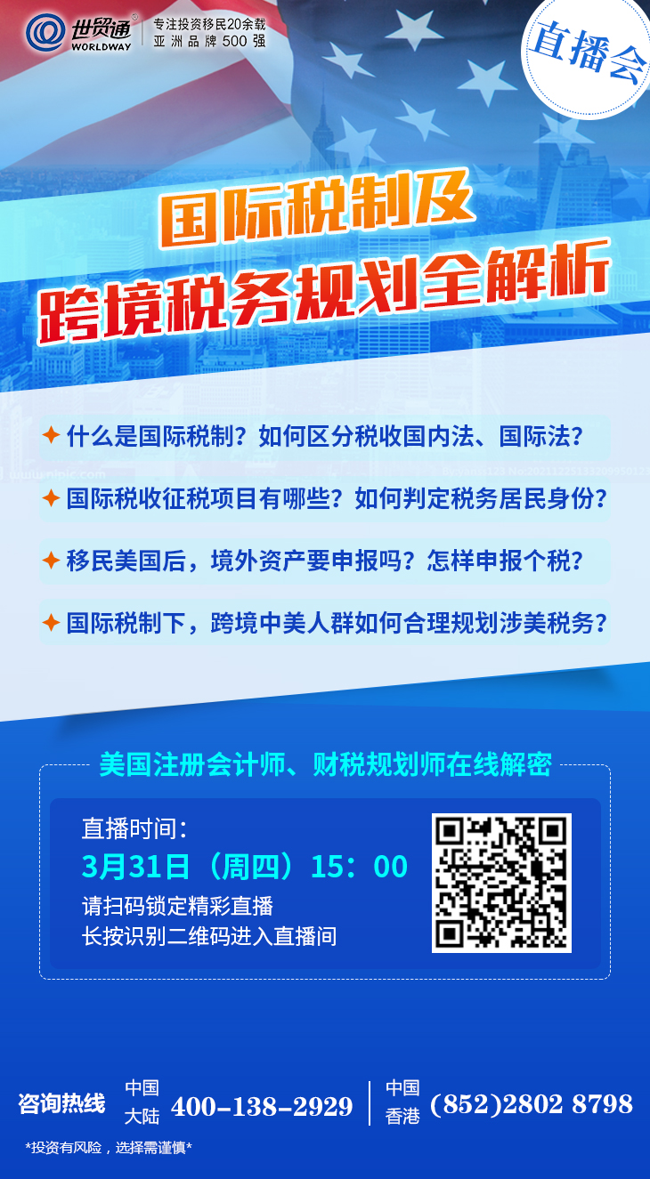 为了帮助广大投资者,解决移民美国前后的税务规划问题,世贸通特邀美国注册会计师、财税规划师在线为您详细解密,深度支招美国新移民登陆前后的节税规划,不容错过!