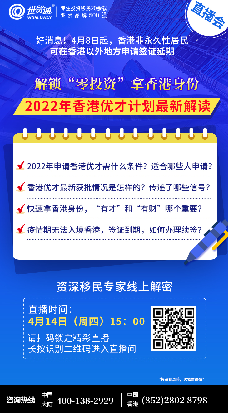 4月14日(周四)15:00,解锁“零投资”拿香港身份:2022年香港优才计划最新解读!