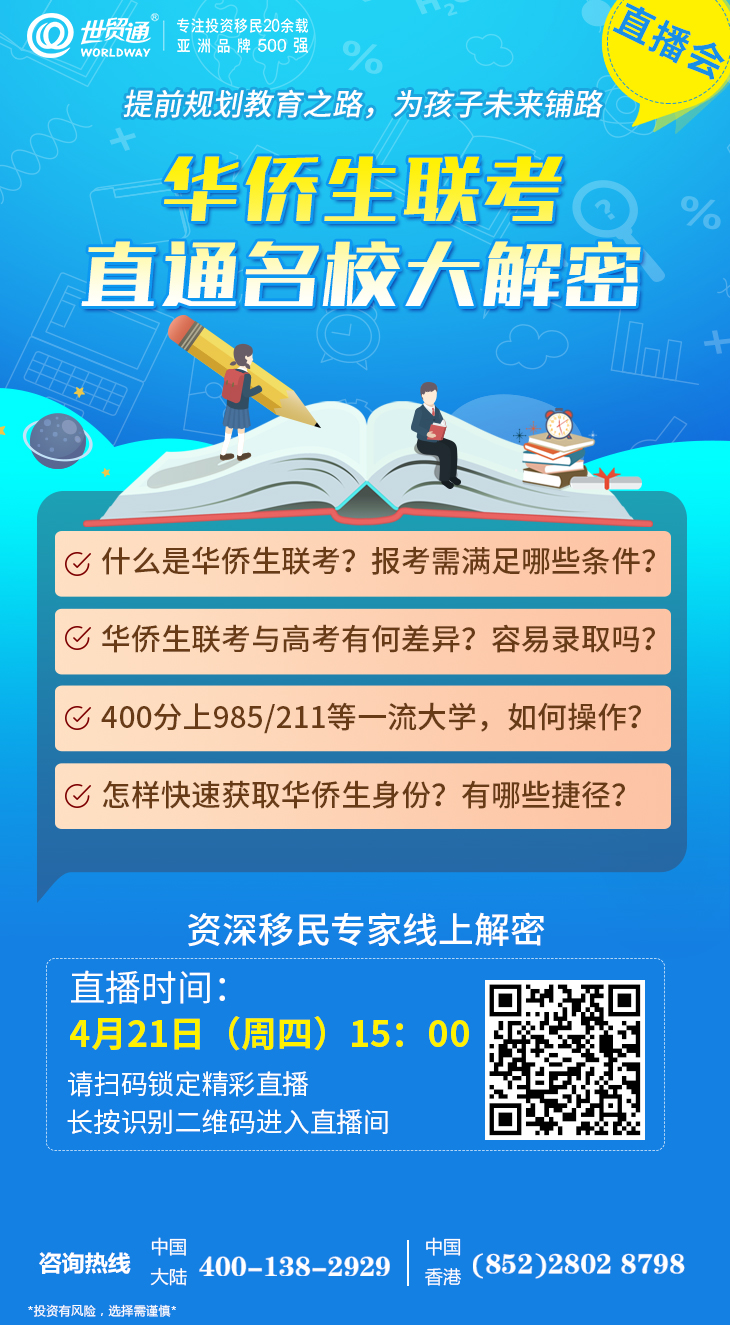 为帮助因子女教育、华侨生身份规划等原因而移民的中国家庭,解决孩子升学规划等问题,世贸通特邀联考中国华侨生港澳台学校资深教育专家做客直播间,全面解析您关注的华侨生联考的那些事儿,请锁定世贸通本场直播,精彩别错过!