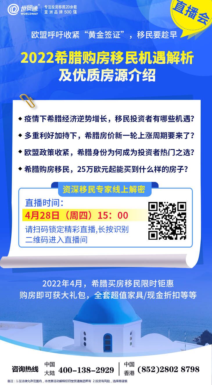 疫情下希腊经济逆势增长,移民投资者有哪些机遇?多重利好加持下,希腊房价新一轮上涨周期要来了?欧盟政策收紧,希腊身份为何成为投资者热门之选?希腊购房移民,25万欧元起能买到什么样的房子?请锁定“世贸通直播间”,别错过!