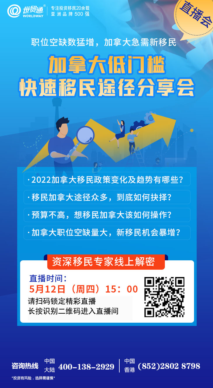 对于已经作出加拿大移民决定的人士而言,如何把握加拿大移民黄金期?2022加拿大移民政策变化及趋势有哪些?移民加拿大途径众多,到底如何抉择?预算不高,想移民加拿大该如何操作?世贸通特邀加拿大资深移民专家在线解密,并为您分享低门槛快速移民加拿大的高效方法,请锁定“世贸通直播间”,别错过!