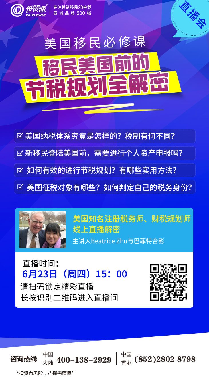 为了帮助广大移民投资者,解决移民美国前的税务规划问题,世贸通特邀美国知名注册税务师、财税规划师在线为您解密美国税务真相,深度解析新移民登陆美国前的财税规划,并分享实用的节税妙方,请锁定“世贸通直播间”,精彩别错过!