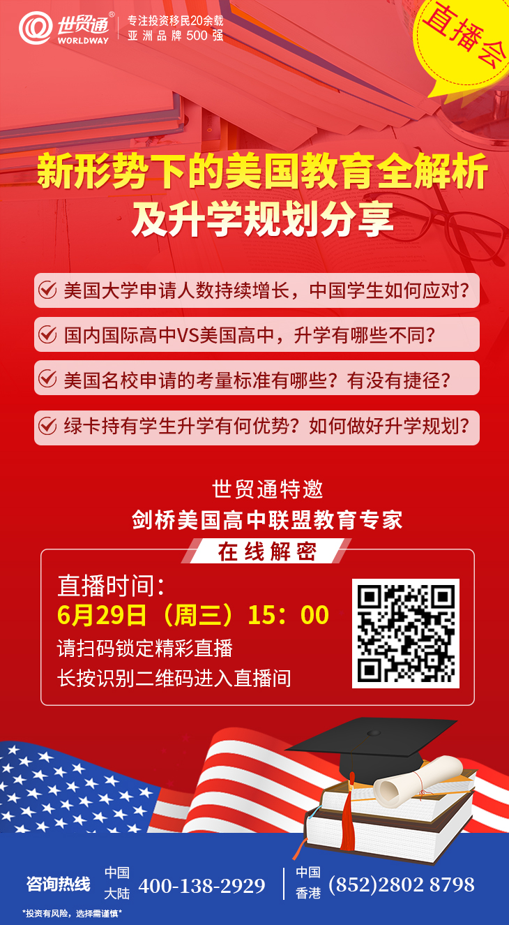 为帮助因孩子教育而移民美国的中国家庭,解决孩子择校定位、名校申请、升学规划等问题,世贸通特邀剑桥美国高中联盟教育专家在线解密,并分享超实用的子女教育经验,请锁定“世贸通直播间”,精彩别错过!